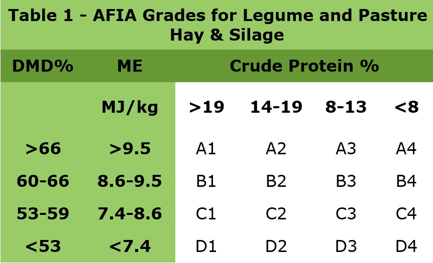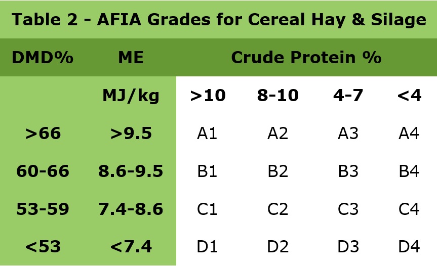 Two separate grading systems have been adopted as shown in Table 1 and Table 2 above. These grades take account of the range in metabolisable energy and crude protein, which can occur in hay and silage and reflect the naturally lower protein content of cereal fodder.