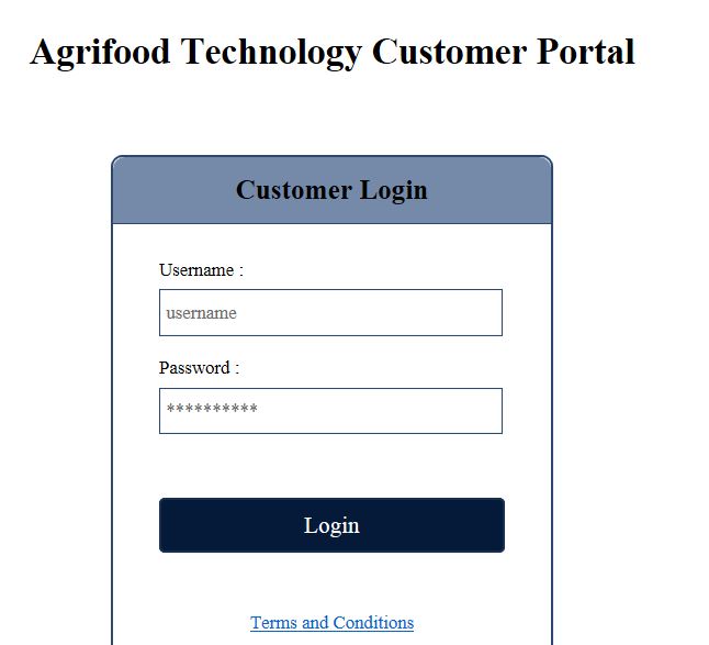 Login: A login screen will welcome the customer as shown below. In order to enter the portal the customer must provide their relevant login credentials: these credentials can be obtained from your Agrifood Technology Client Services Officer.